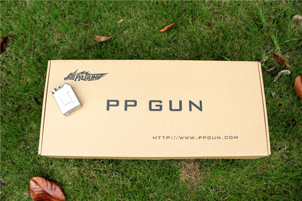 ▲PP-GUN包装采用长方形原色标准纸板,包装正面喷印PPGUN LOGO、名称及官方网站,没有过多的介绍信息,整个包装很大也很简单。