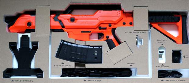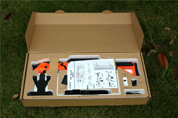 ▲主附件一览:PP-GUN主体、移动设备支架、PP-GUN电池、PP-GUN支架、PP-GUN背带、USB蓝牙适配器(PC)、2.4GUSB适配器(PC)、背带卡座、数据线、PP-GUN身份牌、说明书。