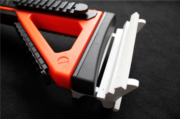 ▲PP-GUN属于全球第一款枪型控制器,整体采用真枪一比一设计制造,手感及操作性极佳。PP-GUN本体采用个性十足的双色搭配,笔者拿到的是橙色款底色为橙色黑色应该是后喷。PP-GUN本体采用单侧一体压膜而成,两侧结合选用黑色十字螺丝固定,整体材质工艺非常突出。