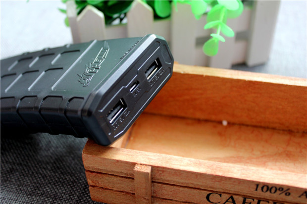 ▲PP-GUN电池配合使用弹JIA外形设计,黑色外形配合多色主体视觉效果非常好,PP-GUN电池容量为9000mAh,配备一个micro USB5V输入口、两个USB5V=2.1A输出口、一组+-接触弹片输出口,USB5V=2.1A适用于连接平板续航。PP-GUN电池表面磨砂处理配合方形压槽具有很好的防滑效果,在PP-GUN电池左侧设有一个电源实体按键,轻按就能有效的显示电池容量,显示采用蓝色LED集合4组灯口非常清楚。